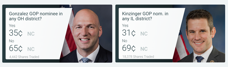 Traders aren't high on two other congressmen who’ve drawn the ire of Trump either. Rep Anthony Gonzales (R-OH) and Rep. Adam Kinzinger (R-IL) are both underwater in the markets tracking their re-election efforts next year. Traders have Gonzalez’s odds slightly higher than Kinzinger at 35¢ to 31¢ for a yes outcome.