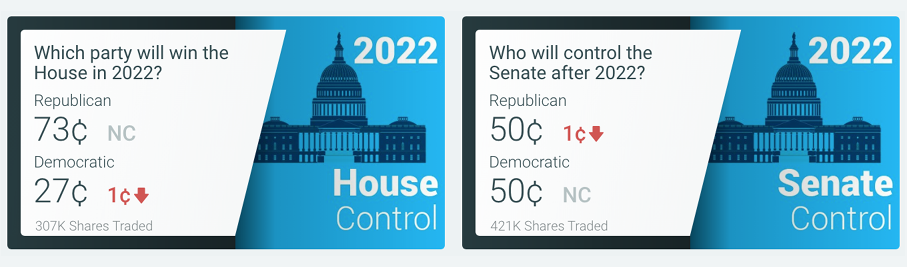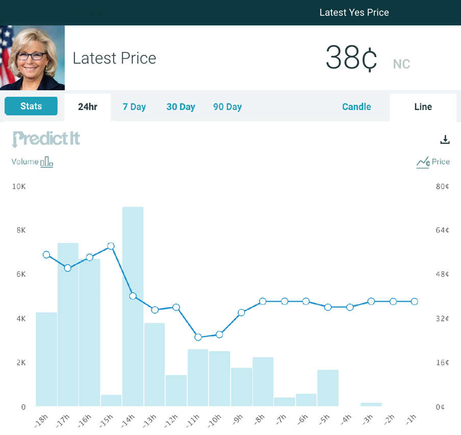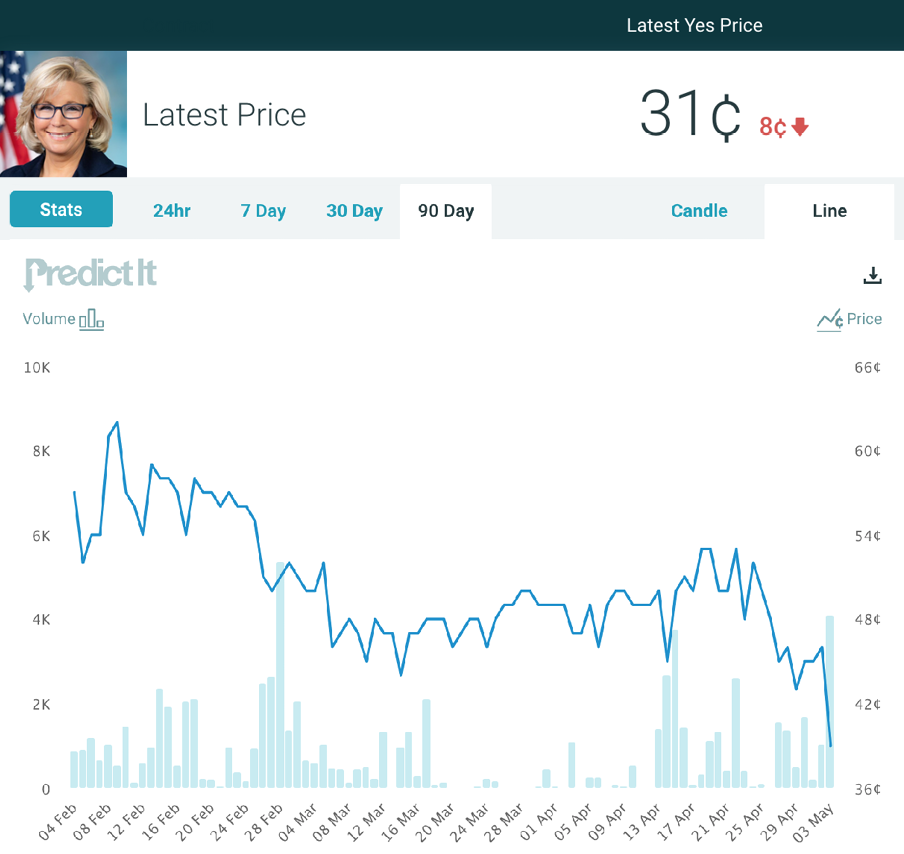 In the 2022 House GOP nomination for Wyoming’s at-large seat, traders are down on Cheney’s odds of winning. Over the past 24 hours, the congresswoman’s share price in a yes outcome fell 7¢ — the single biggest price drop in the last 90 days of trading. Yesterday’s drop in price also means a new market low at close has been set at 39¢. Another 2¢ have been knocked off the contract price as of writing.