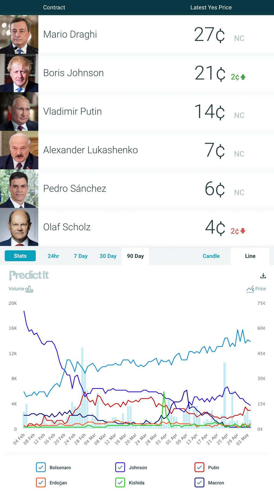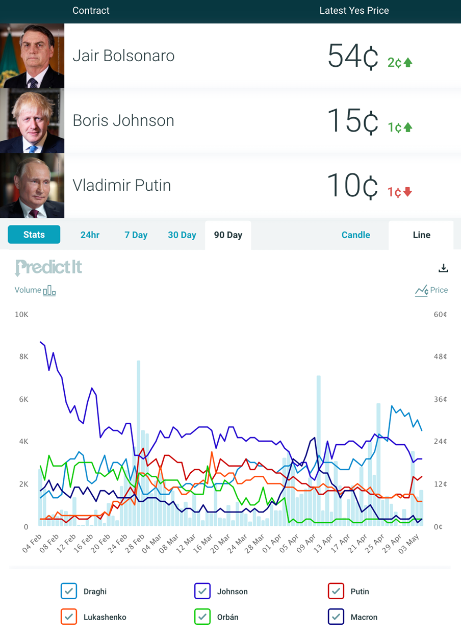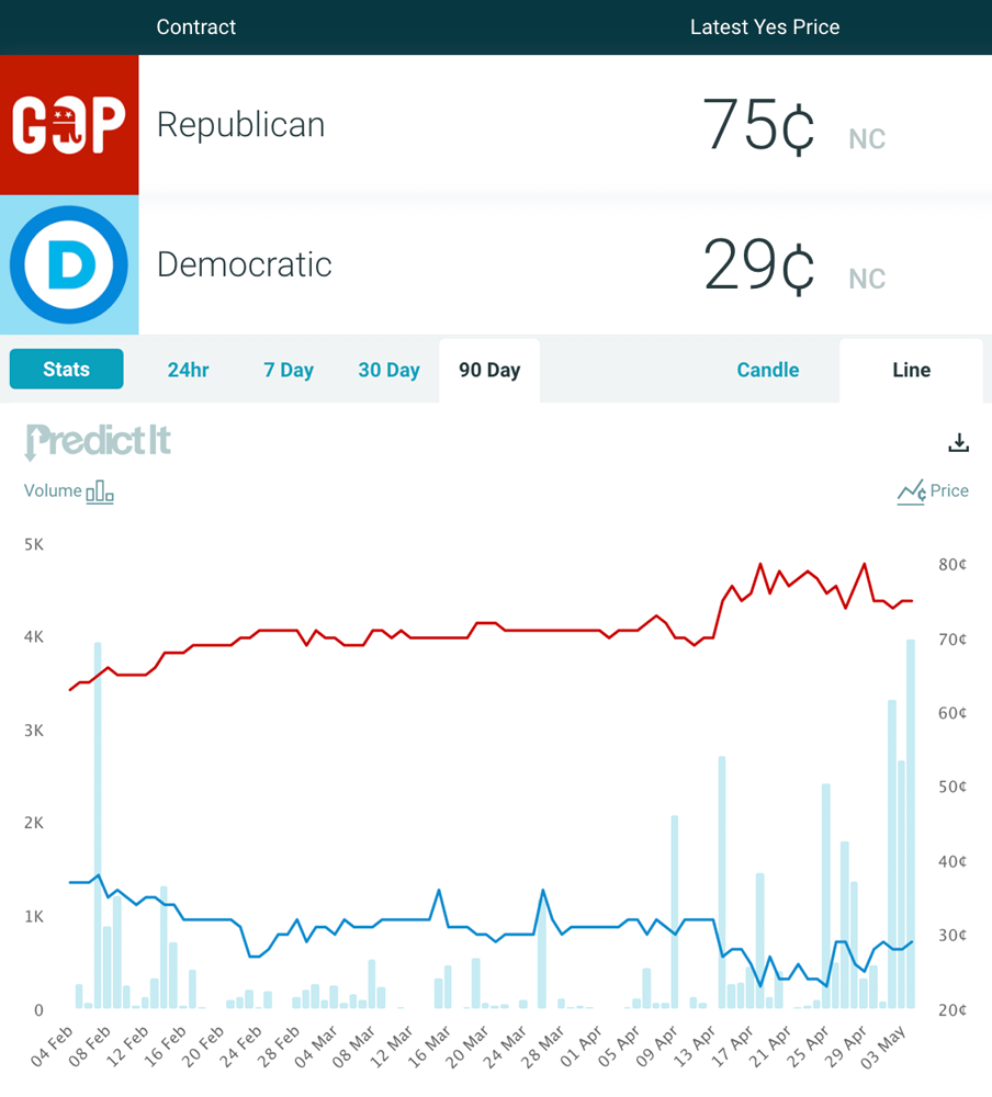 Trade the Markets: Kemp holds a commanding lead over Perdue in the market tracking the GOP nomination race for Georgia’s governor’s mansion — 91¢ to 9¢. As the May 24 primary date has drawn closer, Perdue’s challenge has wilted with his contract down 12¢ over the past month while Kemp’s has risen as high as 93¢ over the same period. With Abrams unopposed, her contract sits at 99¢ in the Democratic nomination market.