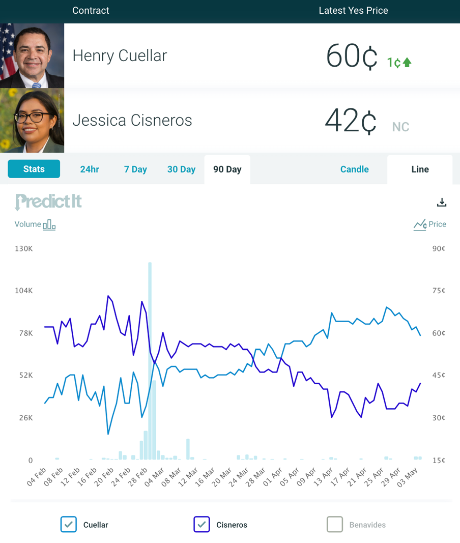 Trade the Markets: The 8th District’s Democratic primary runoff is set to take place on May 24, marking the culmination of a tight race that has drawn national attention. Less than three week’s out, Cuellar is the market favorite to beat Cisneros in the runoff, 59¢ to 42¢. The two candidates have traded the top spot on multiple occasions over the last three months and Monday’s news saw Cisneros gain 6¢ to close at 40¢. A potential worrying trend for Cuellar contract holders is that since hitting a market high of 69¢ on April 26, his contract has trended downward, while Cisneros has gained 9¢ in the same period.