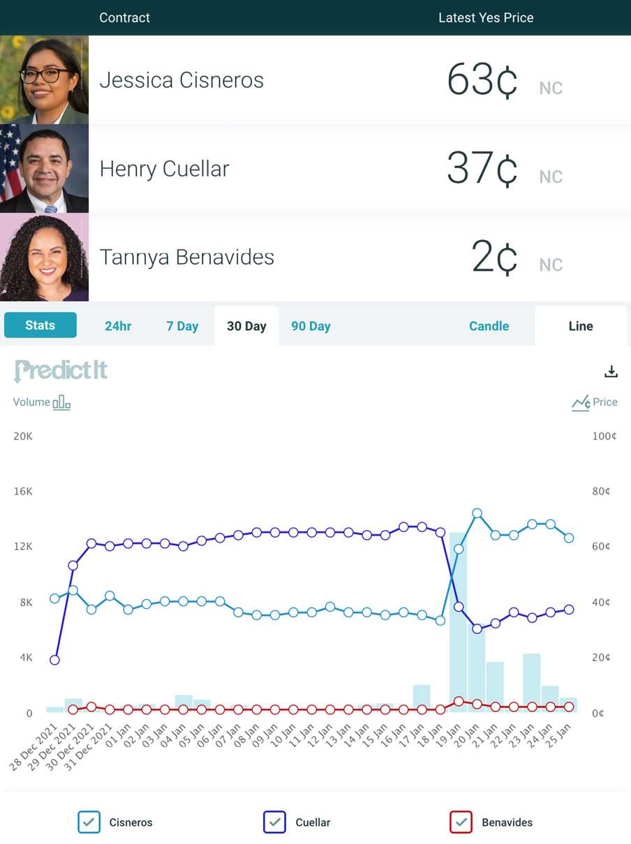 Market Pulse: While Cuellar still has high name recognition and a robust donor base, the crowd continues to favor Cisneros over the incumbent — 63¢ to 37¢ — since the market flipped last week on news of the raid. That said, turnout tends to be lower in midterm election years, which could benefit Cuellar and the crowd could be factoring that in with its pricing since the raid. The incumbent’s contract has risen 7¢ since dropping from 65¢ to 30¢. Cisernos’ contract, meanwhile, has gone the wrong direction since topping out at 72¢ — losing 9¢.