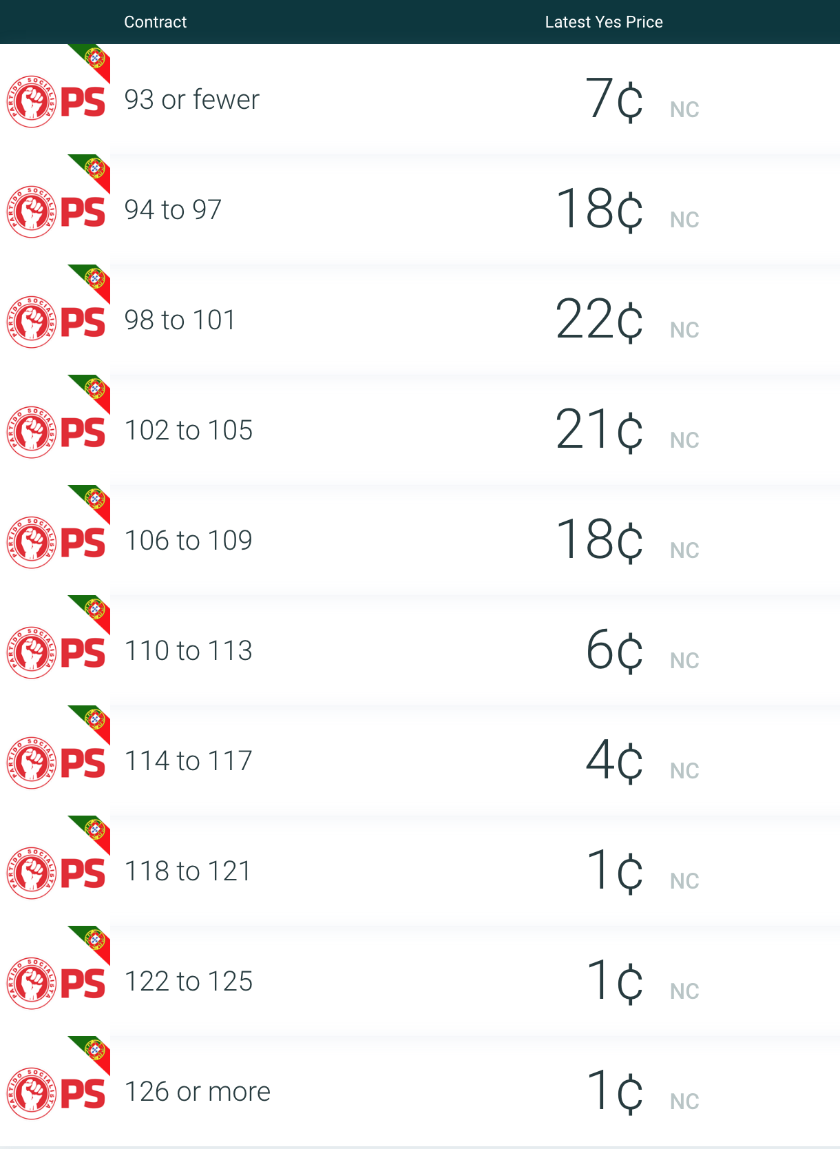 Market Pulse: With the Socialists holding 108 seats currently in the Assembly of the Republic and needing 116 seats to gain a majority, the crowd suspects that just such an outcome is not likely on Sunday. What is more likely at the moment is that the Socialists will lose seats — with contracts for “98 to 101” and “102 to 105” seats the top two contracts at 22¢ and 21¢, respectively. The crowd is also not ruling out contracts for “94 to 97” or “106 to 109” seat totals with both priced at 18¢.