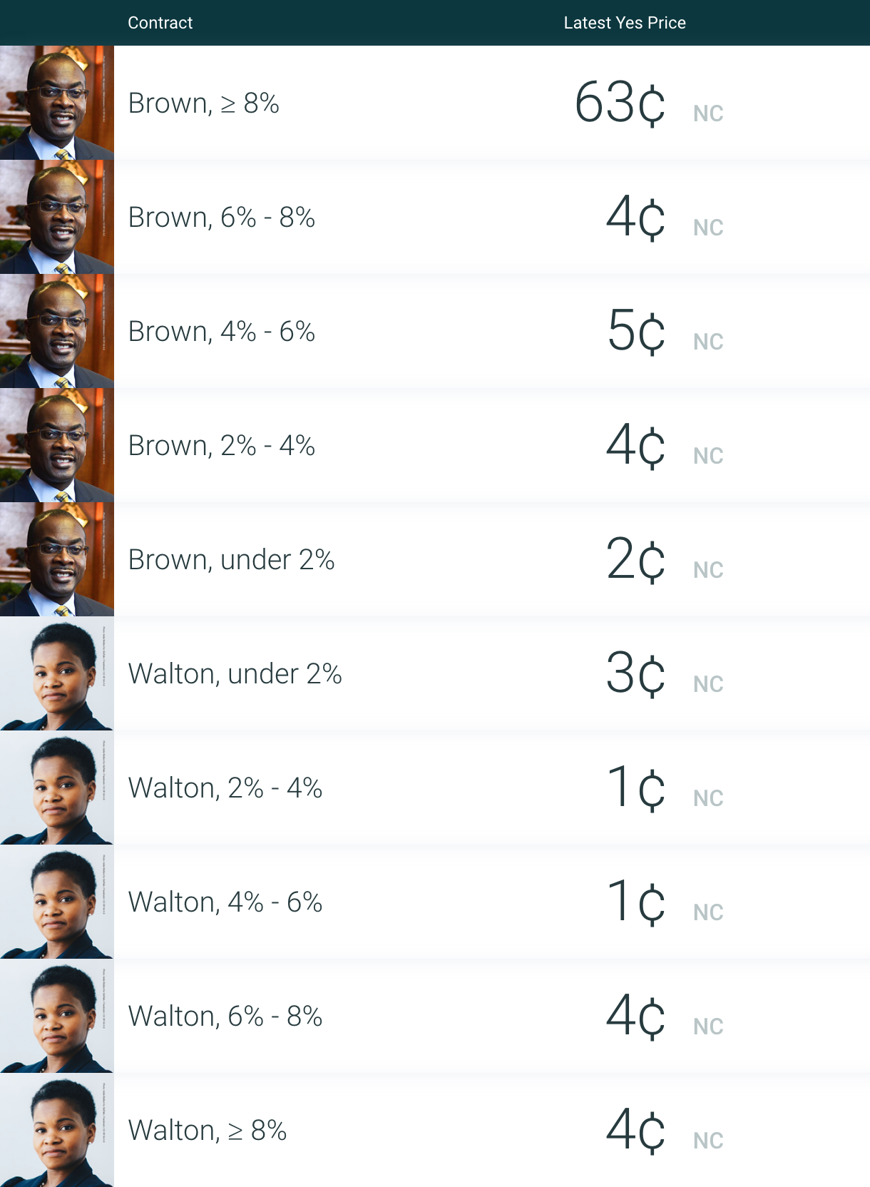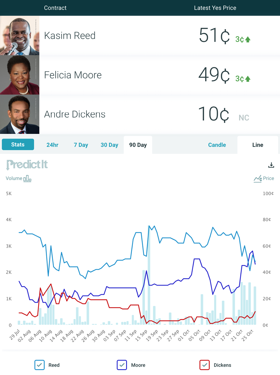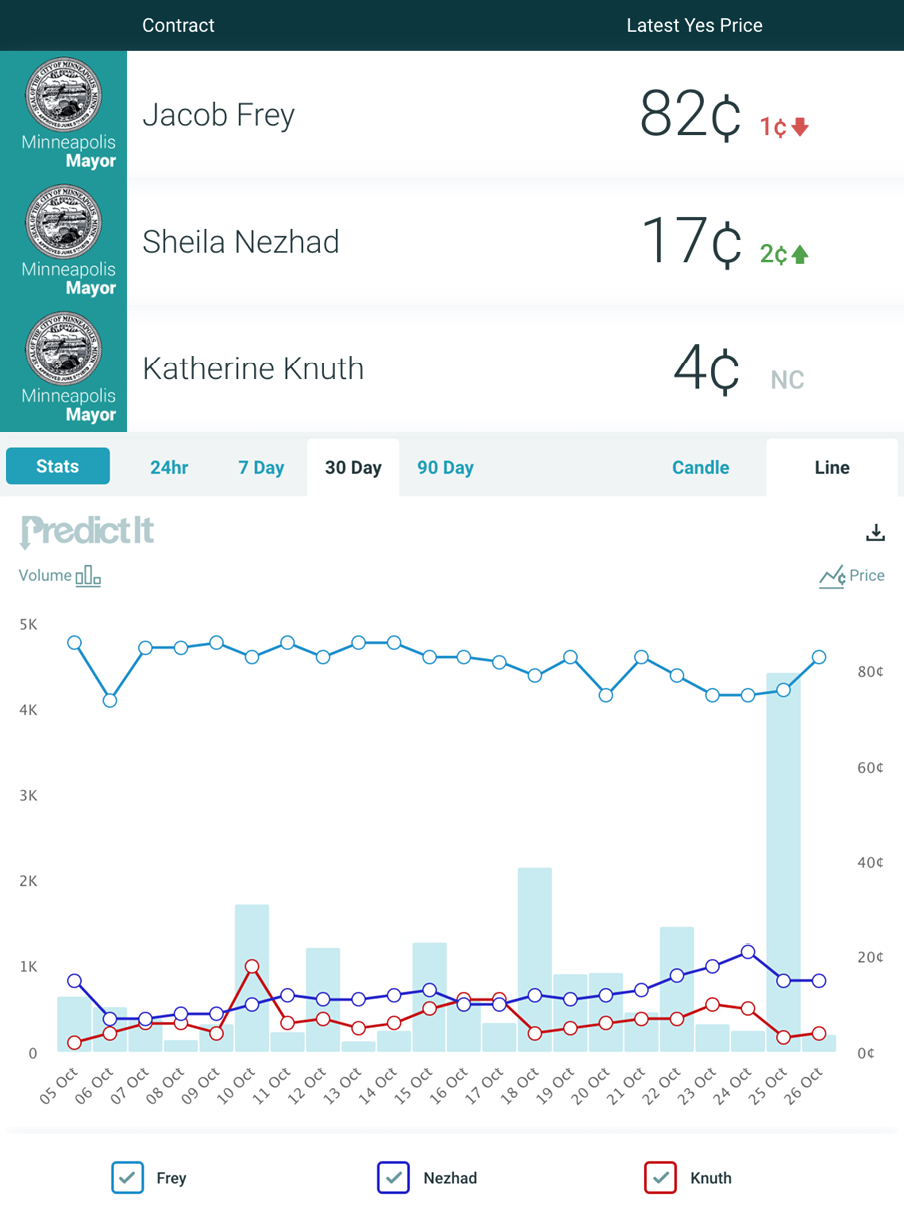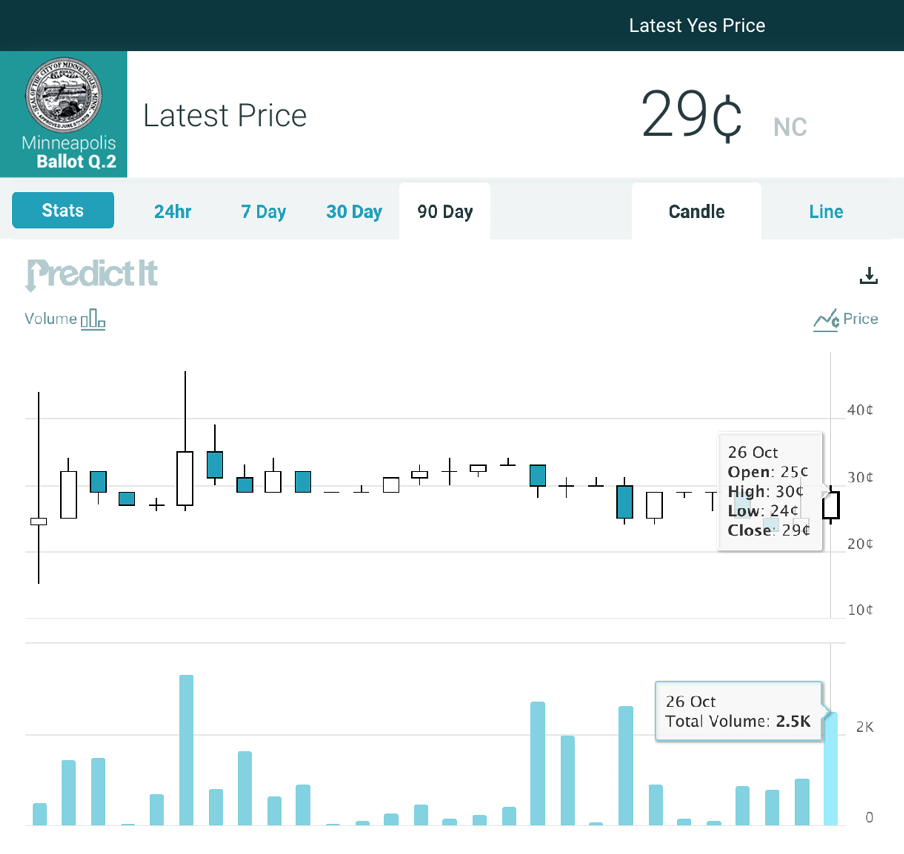 Market Pulse: Will Minneapolis voters pass Ballot Question 2 and approve defunding the city’s police department? Traders say it’s not likely — as the contract, currently trading at 29¢, has never traded above the 50¢ mark since launching on Sept. 29 and its highest close price was just 35¢ on Oct. 4. On the question of who will be elected Minneapolis mayor, traders believe strongly in the incumbent, Jacob Frey, to earn another term. His contract enters trading at 83¢ today and hasn’t traded below 74¢ outside of the opening day of the market going live.