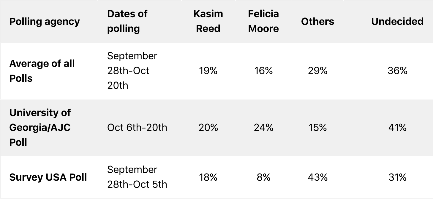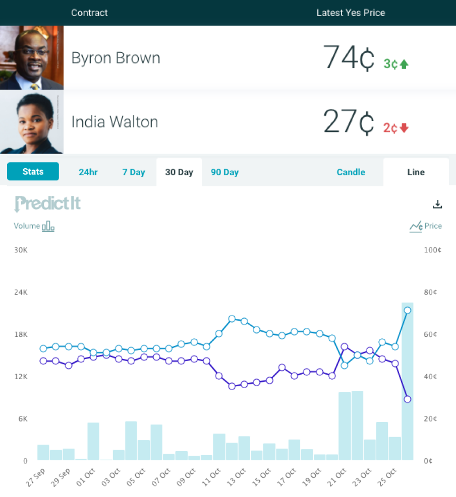 2021 Atlanta Mayoral Race Polls: Incumbent Mayor Byron Brown was up four points from August to 54% support in the latest poll. That places him 18 points ahead of India Walton, the Democratic nominee, at 36%.