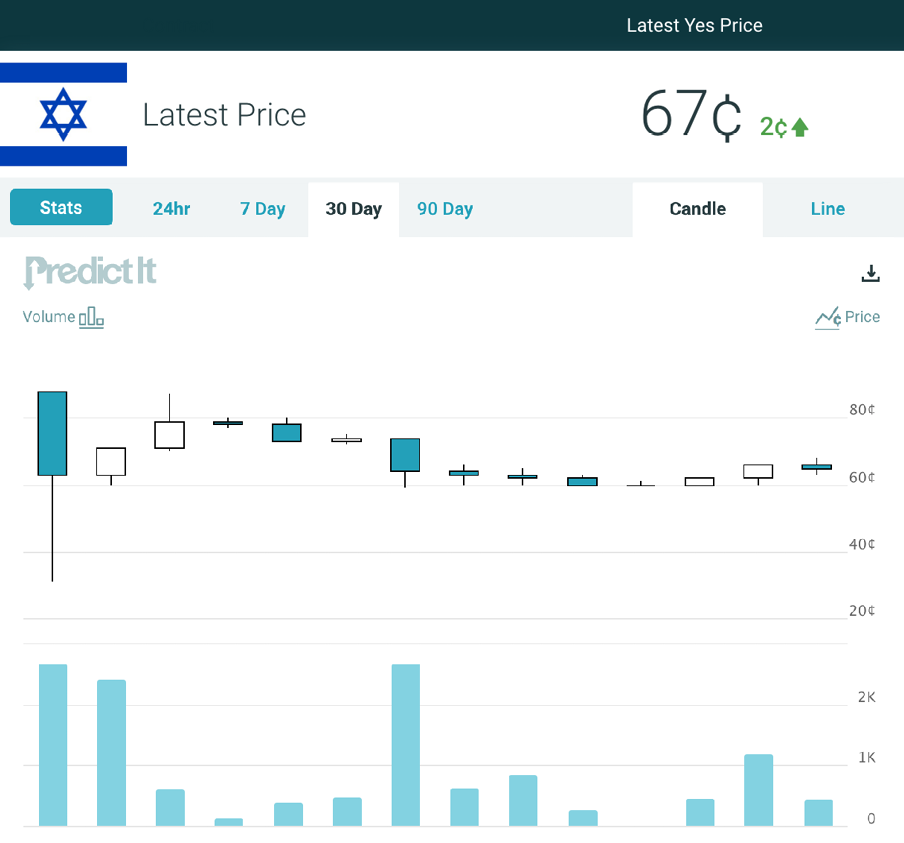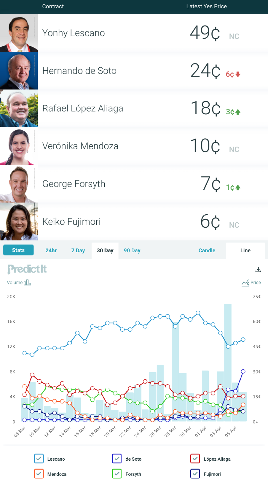 Market Pulse: Since launching in March, traders have placed their money on Lescano to be the next president of Peru. The Popular Action congressman opened trading at 49¢ today, putting him 19¢ above de Soto and 34¢ ahead of López Aliaga. It should be noted that the “hot” candidate at the moment is de Soto. He's seen his share price rise from 2¢ on April 2 to 30¢ as of close yesterday.