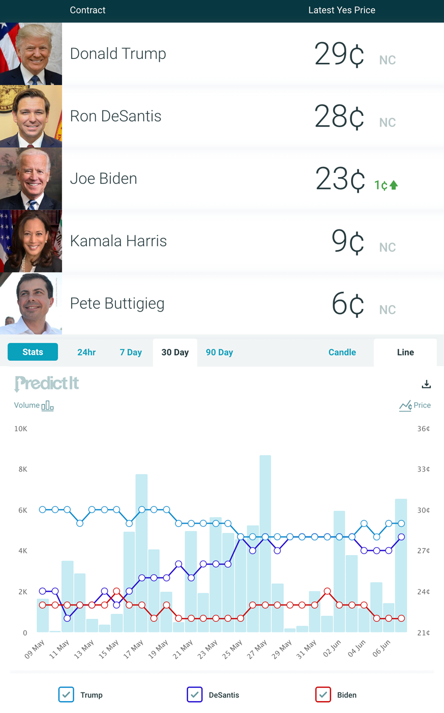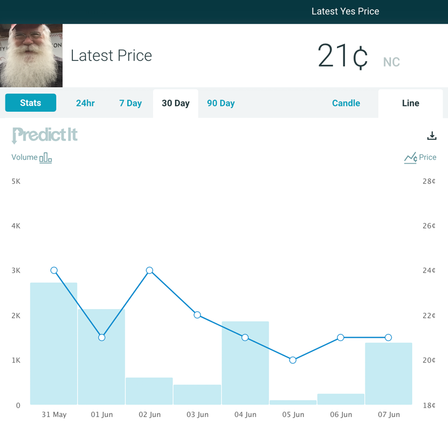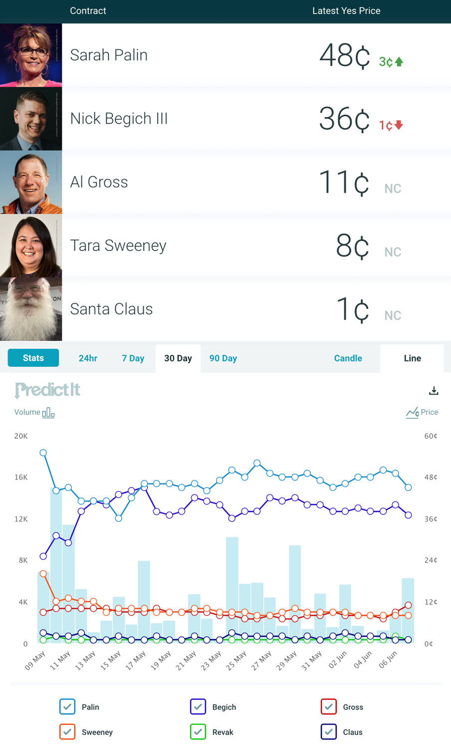 Market Pulse: The race to finish out Young’s term in the Alaska at-large special election suggests that Palin is best-placed to win at 45¢, followed by Begich at 37¢. The crowd also expects the former governor to come out on top of Saturday’s primary at 77¢, which gives her a 61¢ lead over Gross. But perhaps all anyone cares about in this race — at least outside of Alaska — is if Santa will make it into the top four! The crowd gives the man from North Pole, Alaska, a 21¢ chance of capitalizing on his name recognition and see his name on the final ballot for Aug. 16.