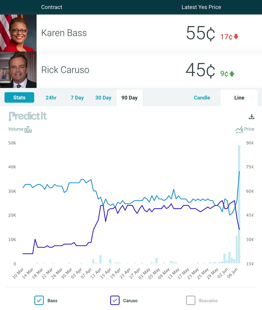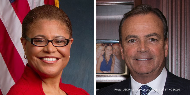 An early tally of mail-in ballots showed billionaire developer Rick Caruso leading Rep. Karen Bass (D-CA), 41% to 38%, in the race for Los Angeles mayor. With neither candidate likely to surpass the 50% threshold needed to avoid a runoff, both candidates are likely advancing to a November showdown.