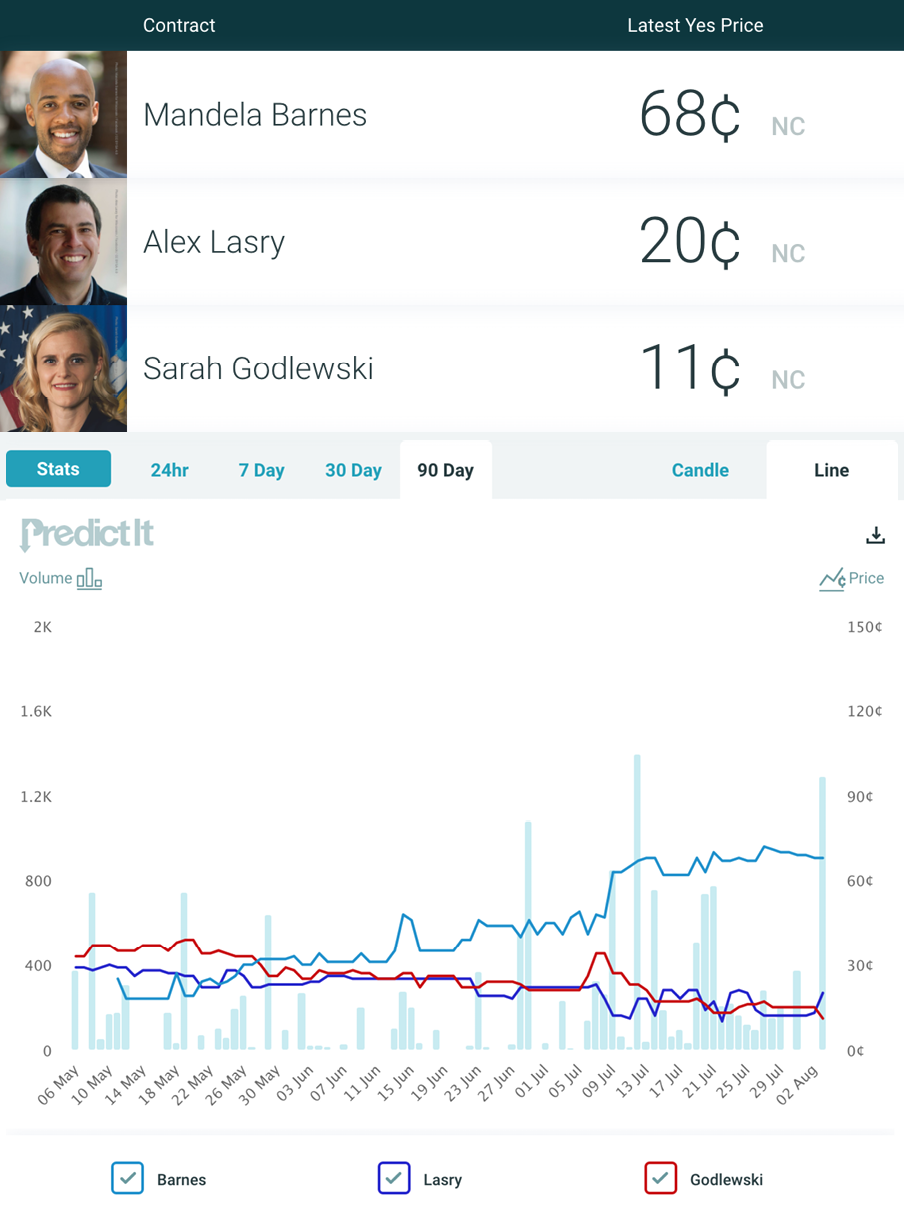 The Democratic nomination for Senate in Wisconsin is likely to go to Mandela Barnes, at the moment. His contract was at 68¢ Tuesday — 48¢ higher than the next-leading potential candidate, Alex Lasry. Barnes has led this market, with increasing popularity, since May 28.