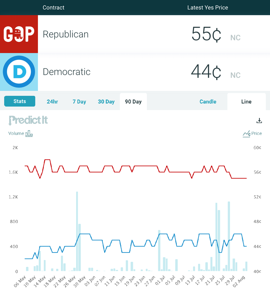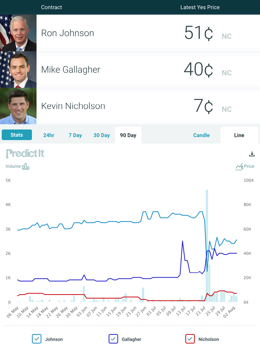 Market Pulse: The markets still have Johnson winning the Republican Senate primary for Wisconsin next year, but just barely – at 51¢. Mike Gallagher is second with 40¢. They’re the only two candidates with strong numbers, no one else even breaks double digits as of Tuesday. Johnson took a massive nosedive near the end of July, from a high of 74¢ to a low of 25¢, but he has since recovered some of that ground to his current position. Along similar sentiments, traders are sticking with 55¢ as the price for Republicans to win the Senate election – likely a reflection of Johnson holding an incumbent’s advantage. This market is unlikely to shift drastically until Johnson makes up his mind publicly one way or another.