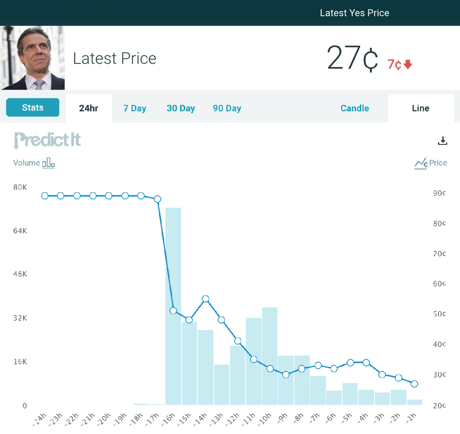 It’s Wednesday and here are a few PredictIt forecasts worth keeping an eye on: Before we get to your usual Wednesday program of under the radar markets, we have to talk briefly about what happened with New York Governor Andrew Cuomo (D) on Tuesday. And boy, did it shake up the Cuomo-focused markets and got the attention of President Joe Biden (not a good thing for the governor).