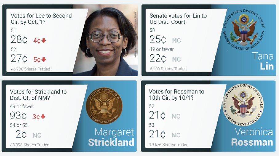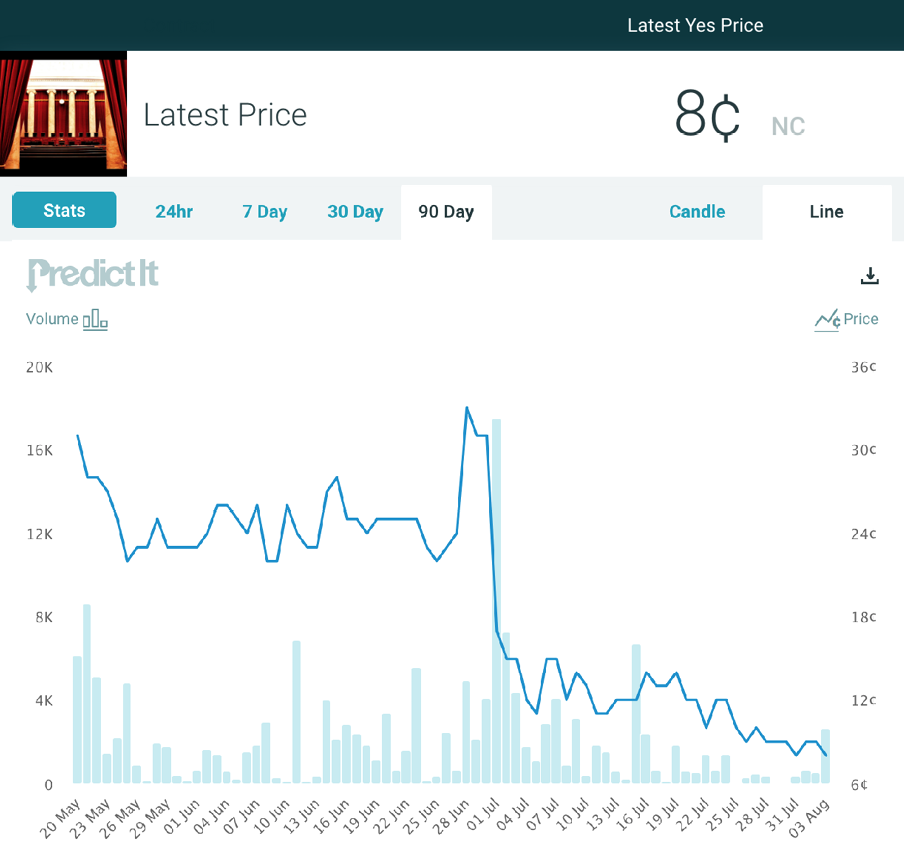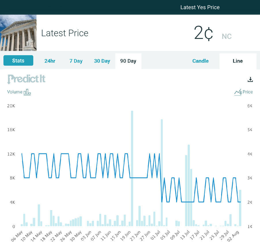 Market Pulse: As far as the effort to expand the number of justices on the Supreme Court, trader sentiment has been cool on this possibility since the market opened, vacillating between 3¢ and 4¢, and not above 3¢ since the first days of July. The market has garnered a decent amount of interest, with more than 1.3 million trades and new interest each time the issue makes new headlines.